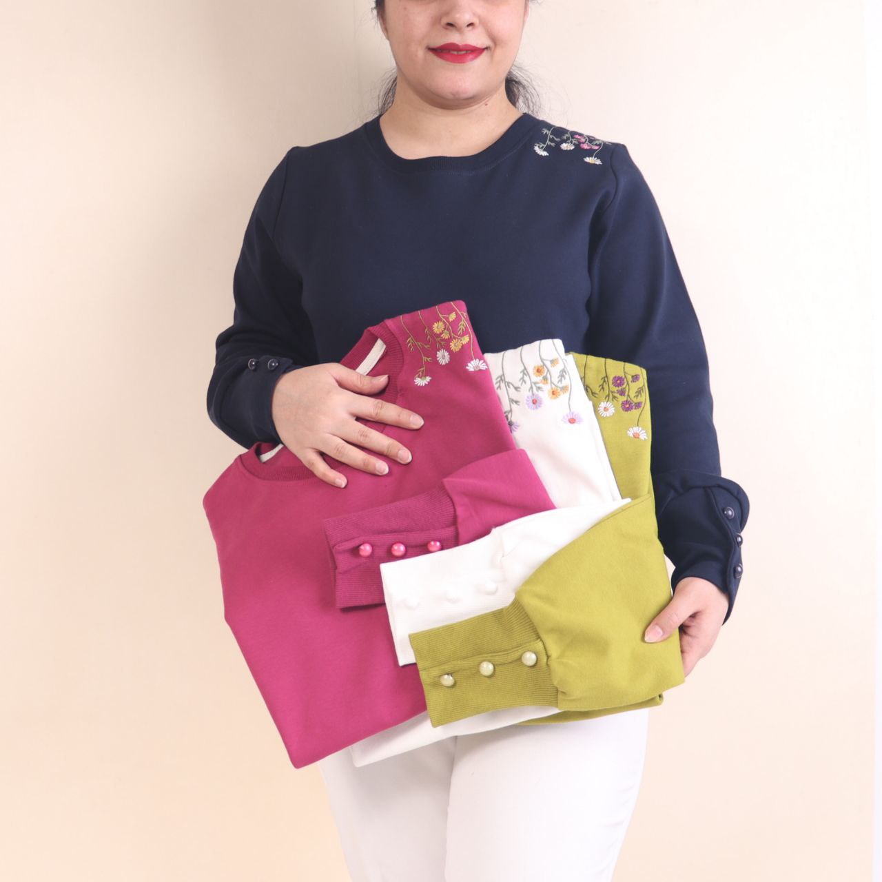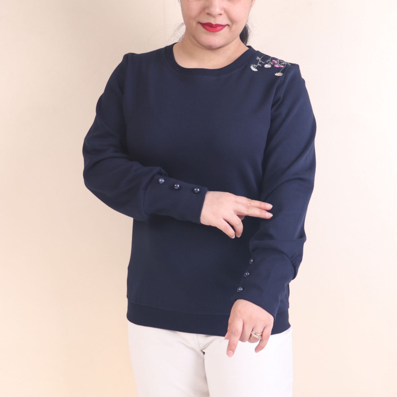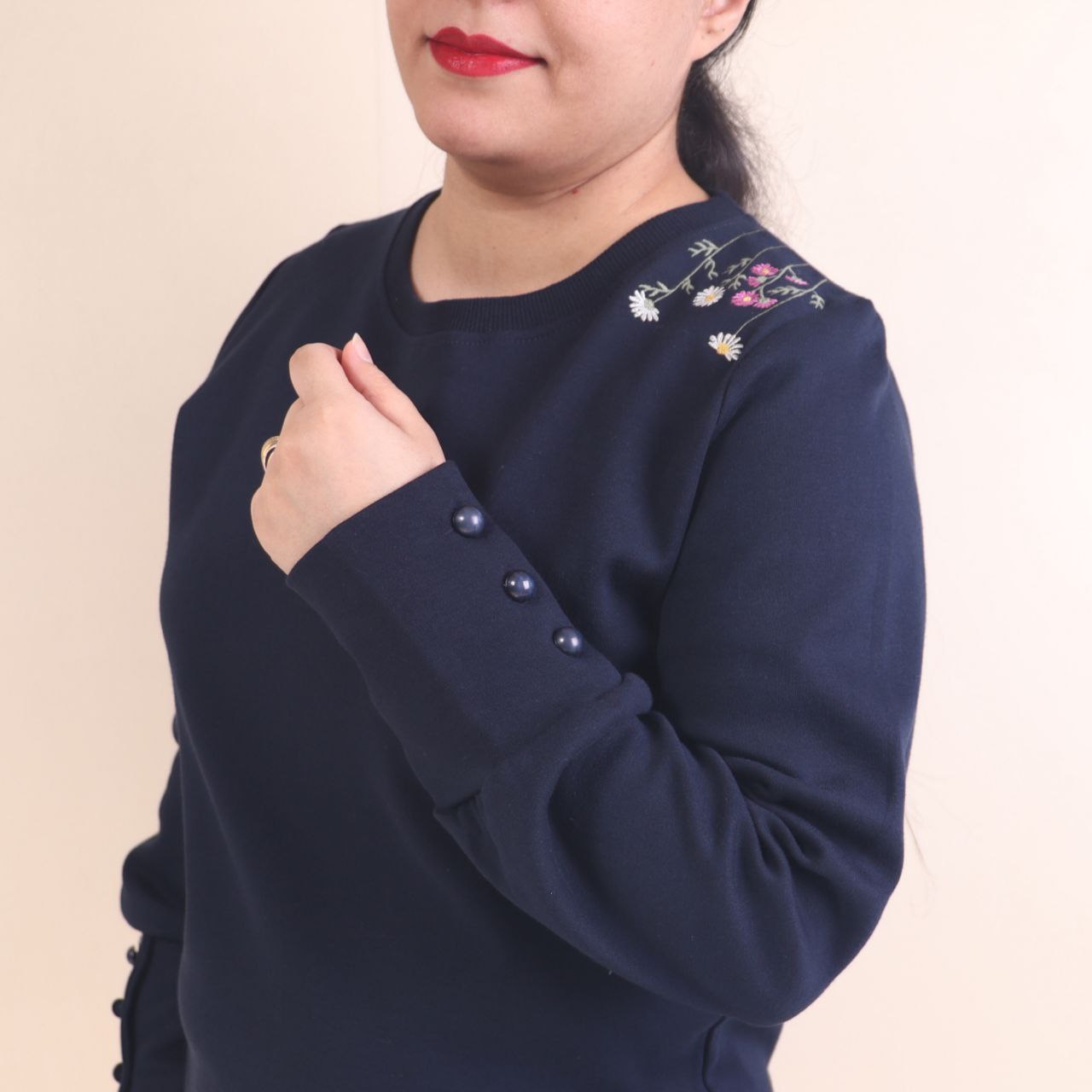 طرح روی بلوز گلدوزی شده است و دکمه های آستین نما هستند.
