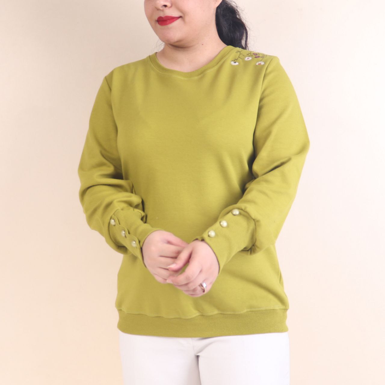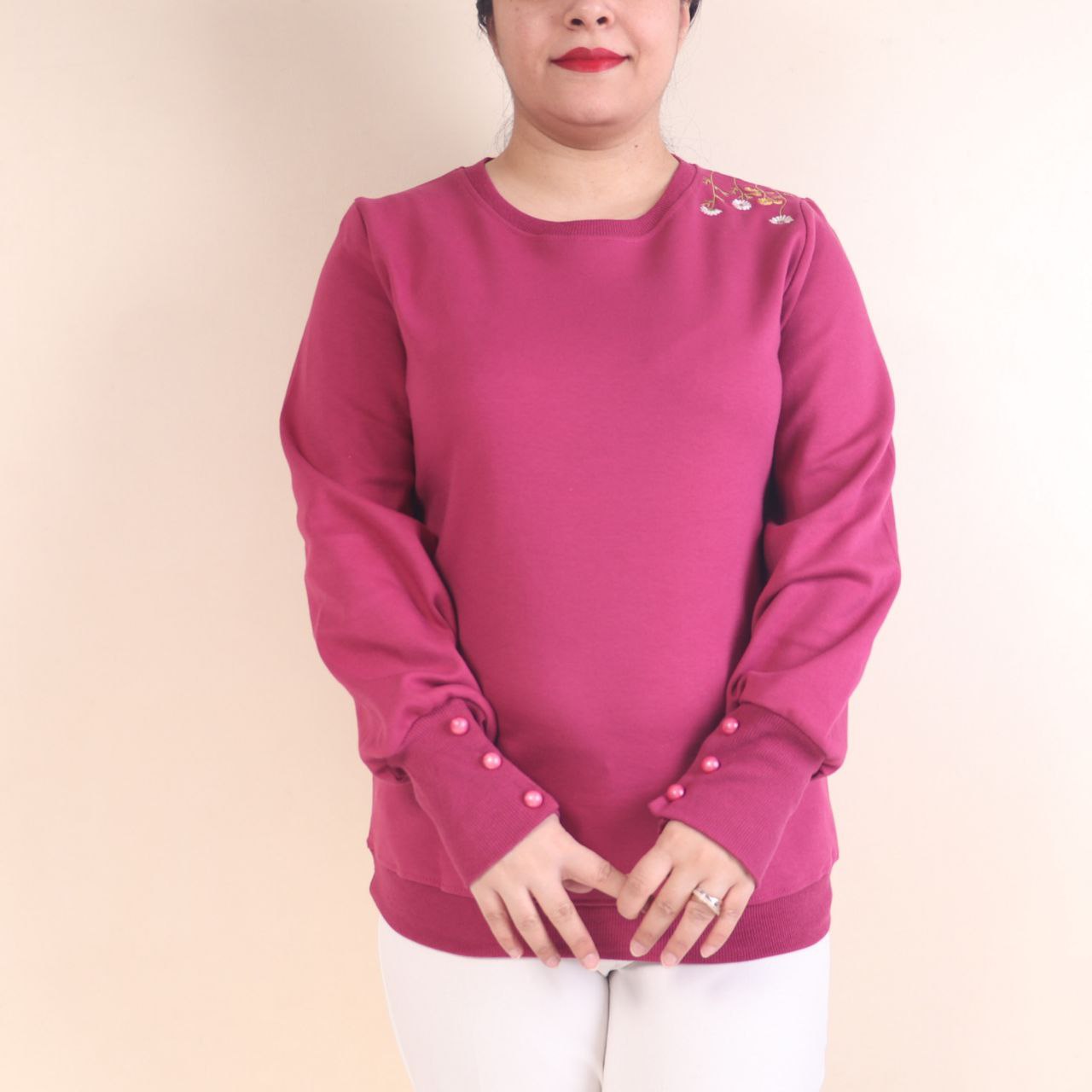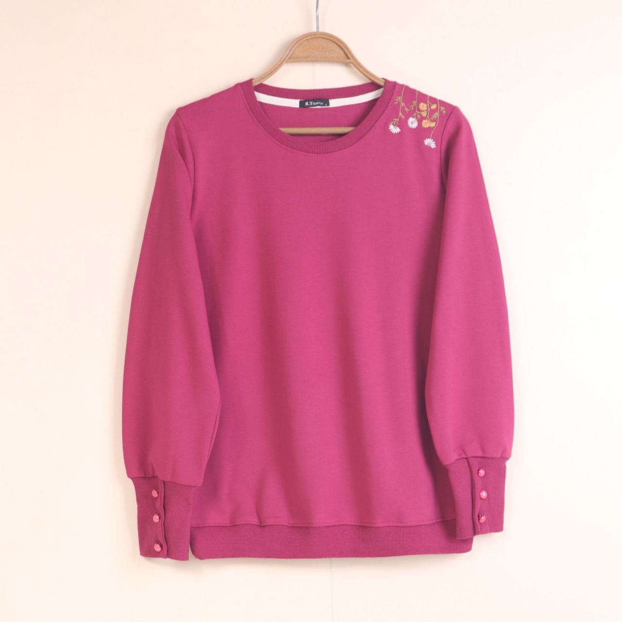 طرح روی بلوز گلدوزی شده است و دکمه های آستین نما هستند.